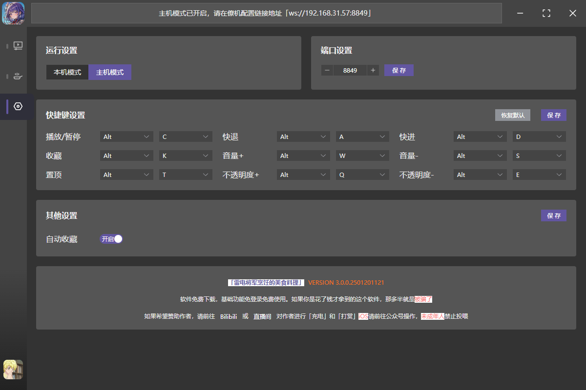 主机端「运行设置」切换为「主机模式」(如果有需要可以在「端口设置」切换端口,点击保存按钮后生效)
